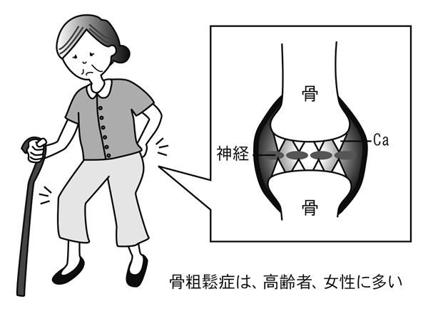 骨粗鬆症が、高齢者、ことに女性に多いことはよく知られています。カルシウム不足になると、血液の中のカルシウム濃度を低下させないために、副甲状腺ホルモンが骨からカルシウムを取り出して血液中に補うしくみになっています。このことを繰り返すうちに骨のカルシウムが減少してゆくのが、骨粗鬆症です。