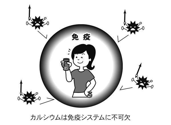 カルシウム欠乏が細胞内のカルシウムを増やすというカルシウムパラドックスは、細胞の生命にとって、大きな危機をもたらします。カルシウムを充分に摂っていれば、余分な副甲状腺ホルモンが分泌されることもなく、免疫細胞の中にもカルシウムが異常に増えることはありません。感染に対する抵抗力を保つには、日頃からカルシウムを十分に摂ることが、何よりも大切なのです。