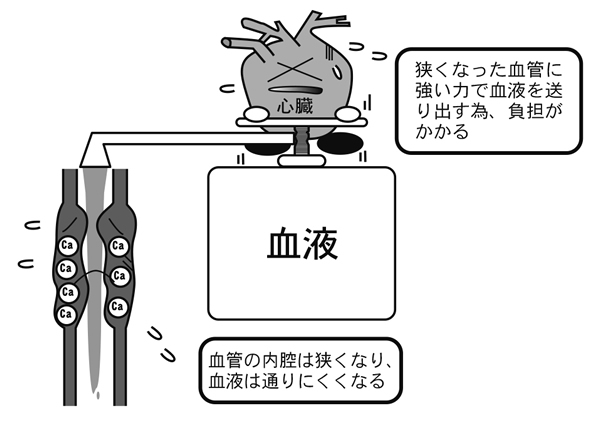血液は血管の中を強い勢いで流れています。血管が狭くなると、ポンプである心臓は、より強い力で血液を送り出そうとするため、大きな負担がかかります。と同時に、血管にも強い圧力がかかります。