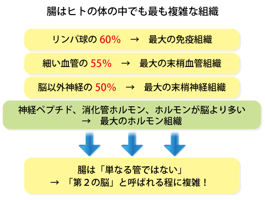 腸は、ヒトの体を守っているリンパ球の60%が集まる、最大の免疫組織です。また、首から下の神経の50%以上が集まる最大の末梢神経組織が集中し、体の中の毛細血管などの小さな血管の55%が腸に集まっています。さらにまた生体内で最大のホルモンを産生している事が、示されました。すなわち腸は「第2の脳(second brain)」と呼ばれるほど複雑な組織である事が明らかとなったのです(日本消化器学会HPより)。