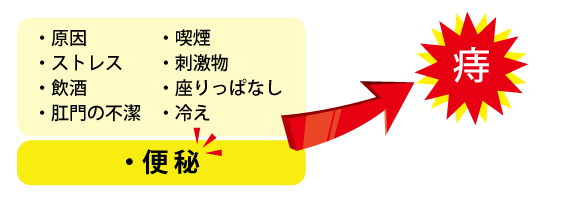 痔には様々な種類があります。その原因もいろいろですが、直接的にも間接的にもほぼ共通している原因の1つは、便秘です。便秘を解消すれば、全ての痔は治るというわけではありませんが、便秘を解消せずして、痔の完治はないと言ってよいでしょう。