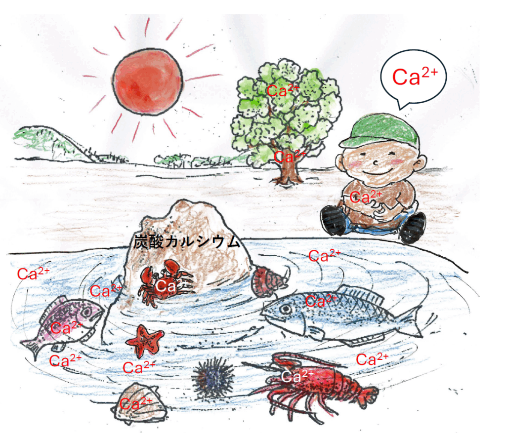 【イラスト:工藤佳久 海水にはカルシウムイオン(Ca2+)が含まれており、多くの生物の生命を生み出し育んでいる。人間を含めた陸生動物には血液中に必要な量のカルシウムイオンを保つ仕組みが備わっている。