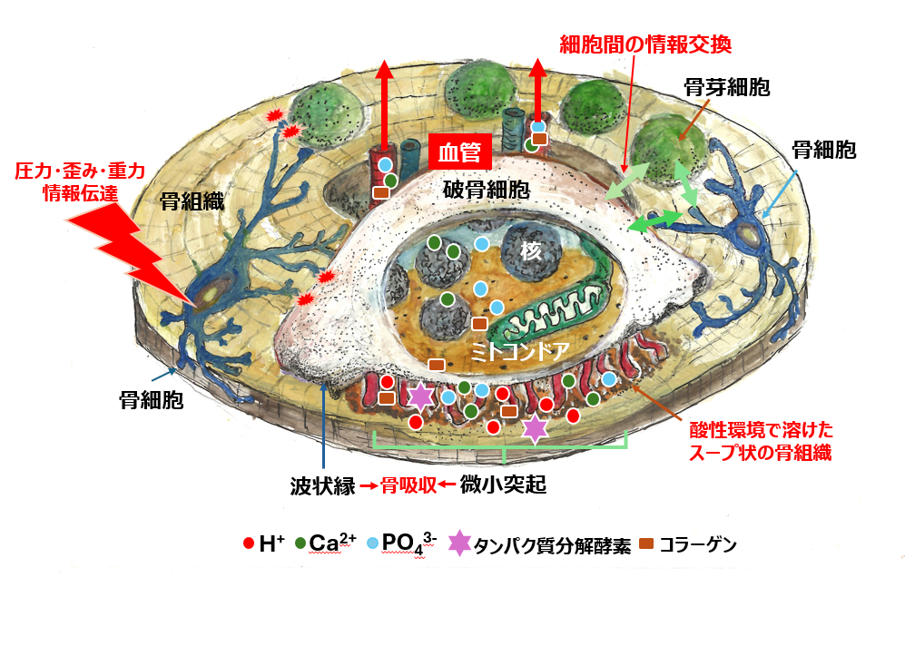破骨細胞は5から20個ぐらい核を持つ大きな細胞です。骨にへばりつき、強い酸性液(水素イオン)とタンパク質分解酵素をふりかけます。その結果、骨組織が溶け液状になります。このカルシウム、リン酸、コラーゲンを含むスープ状の液を波状縁と微小突起で細胞内に取り込みます(骨吸収)。これらの分子を血液に送り込み再利用を促します。破骨細胞、骨芽細胞、骨細胞の三種の細胞は互いにコミュニケーションを取り合って、丈夫で安定な骨組織の形成が行われています。