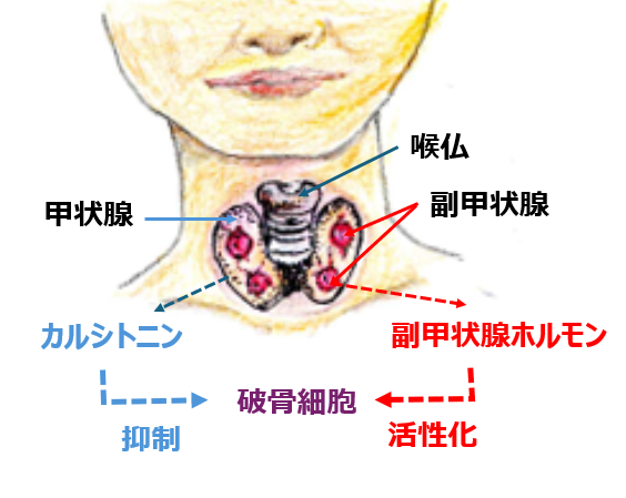 破骨細胞の働きは多様な分子によって制御されています。その内の一つは「カルシトニン」と呼ばれるホルモンです。このホルモンは喉仏(のどぼとけ)の下に蝶のような形で存在する甲状腺から分泌され、破骨細胞の活動にブレーキをかけるのです(図2)。血中へのカルシウムの放出をほどよく制御しているのです。一方、破骨細胞による血中へのカルシウム放出を促進させる仕組みに関わる重要なホルモンがあります。このホルモンが甲状腺の表面に左右に2個ずつくっついている副甲状腺から遊離される「副甲状腺ホルモン(パラソルモン)」です(図2)。